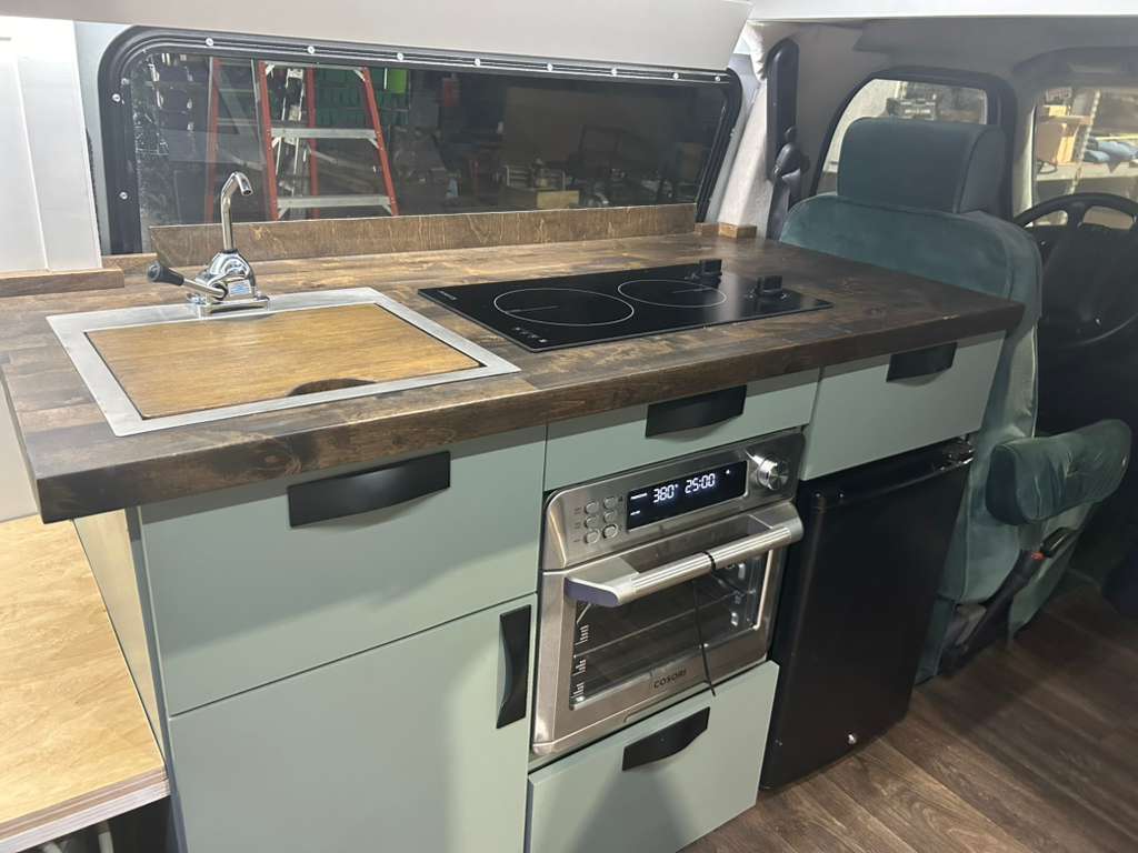 The interior features a complete camper kitchen setup including an induction cooktop, electric oven, refrigerator, and a sink with running water. Custom cabinetry and durable countertops provide practical storage while maintaining a clean and efficient layout designed for travel and everyday use.