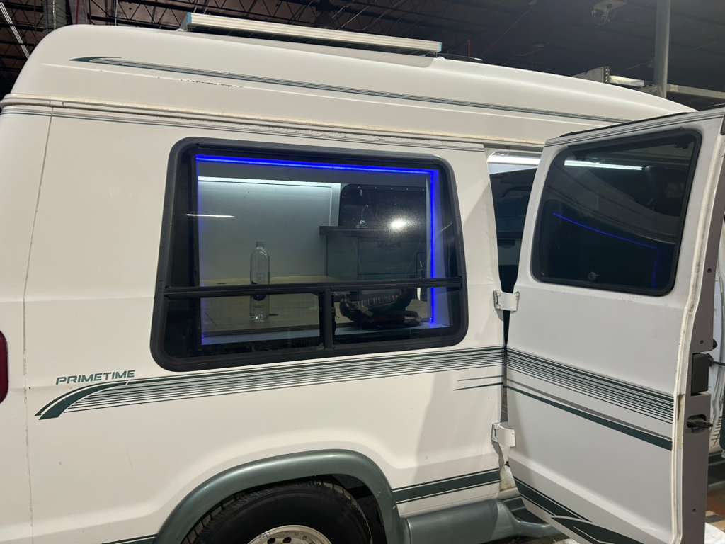 To ensure comfort on the road, the van also includes air conditioning, integrated LED lighting, and a spacious sleeping platform that easily converts the interior into a relaxing living area. Every element of the build was designed to maximize usability while maintaining the charm of this classic Dodge Caravan.